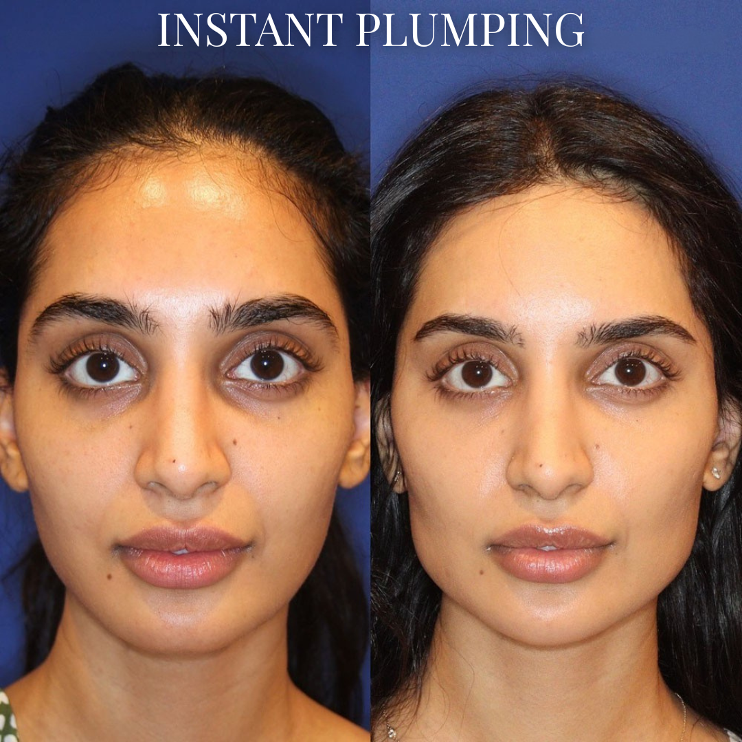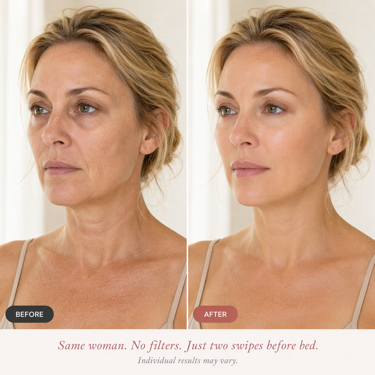 No — and that's the point. Fillers and Botox inject foreign substances into your face, cost $400+ per session, require repeat visits every few months and involve needles, bruising and downtime. This balm uses the same clinical active ingredients topically — pressed directly onto the hollow zones where they melt in and get to work. No needle. No clinic. No $400 bill. No going back every few months.